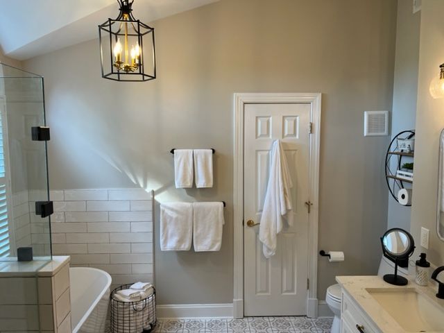 This bathroom was a complete and total overhaul. We removed the dated tub/shower and tile then replaced it with a completely fresh and new fully tiled walk-in shower. Installed new plumbing and electrical fixtures throughout. Relocated the commode as well as his and hers vanities. We installed new flooring and of course what project would be complete without a fresh coat of paint on the walls and trim!