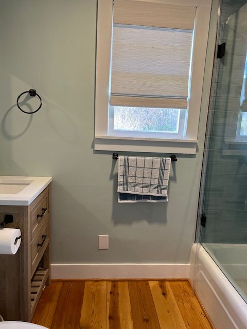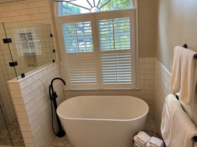 In this bathroom we replaced the outdated framed shower stall with an updated and sleek new frameless shower stall, including new plumbing fixtures as well as installation of a new commode and updated the flooring and finished it up by painting the room for a refreshing new look and feel. he live edge wood shelving adds a rustic touch, and gives a place for candles and decorations.